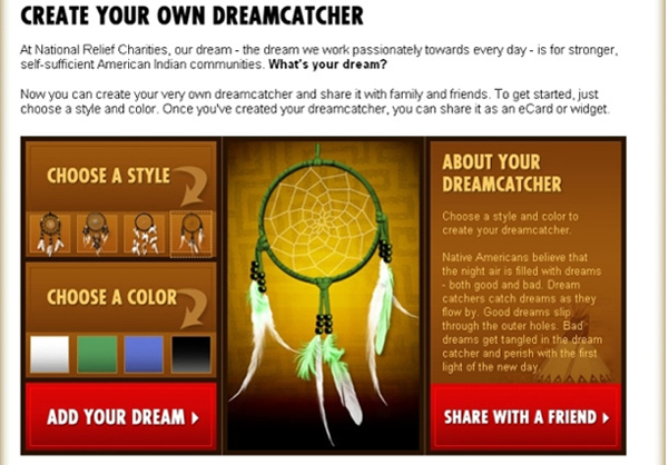 With the help of Convio's Interactive Specialists, NRC was able to leverage online tools to spread their dream. Convio eCards were used to design a rich, interactive experience that allowed users to easily create and share a dreamcatcher with a personalized message. The campaign was used to educate constituents about the meaning and significance behind dreamcatchers. As an incentive, constituents who created a dreamcatcher were entered into a monthly giveaway.