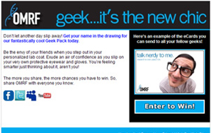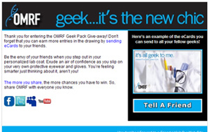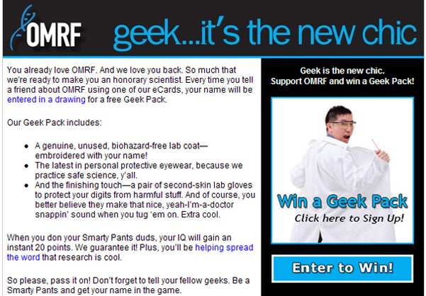 OMRF knows its core audience – fans of scientific research, and also medical professionals, patients, and the families who rely on them. With this audience in mind, OMRF decided to move forward with the theme “geek…it’s the new chic.” With the help of their Convio Go! program consultants, OMRF envisioned an online multi-part giveaway campaign with a chance to win a “Geek Pack.” Current subscribers were invited to enter for the chance to win by simply forwarding funny content (in this case ϋber-cool eCards which OMRF designed based on a Convio template) to friends and family. Each eCard sent counted as an extra entry in the drawing.