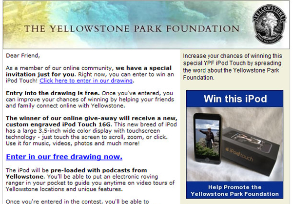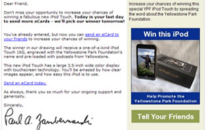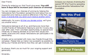 Convio's Go! Program consultants worked with YPF to define an online giveaway contest — publicized entirely by email and the foundation's website — that would highlight compelling features of the park experience while empowering supporters to spread the news within their online networks. The contest prize was an iPod Touch, known for its ubiquitous appeal to tech-savvy individuals seeking music, photos, videos, and more. This particular iPod Touch came engraved by the foundation and pre-loaded with Yellowstone ranger podcasts that would "put an electronic roving ranger" in the pocket of any park visitor. The campaign included a three-part email series to current subscribers, and encouraged entrants to increase their odds of winning by sending eCards about the contest to friends and family, or by donating online.